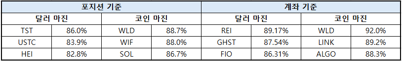 상위 트레이더 기준 종목별 포지션 비중을 살펴보면 포지션 기준으로는 달러 마진 시장에서 ▲TST(86.0%) ▲USTC(83.9%) ▲HEI(82.8%) 순으로 롱 비중이 높게 나타났다. 코인 마진 시장에서는 ▲WLD(88.7%) ▲WIF(88.0%) ▲SOL(86.7%)이 상위권에 올랐다.