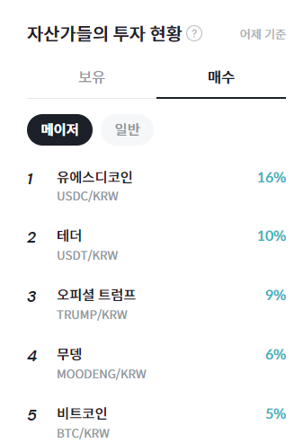 빗썸 집계에 따르면 유에스디코인이 16%로 가장 높은 순매수 비율을 기록했으며, 테더가 10%로 뒤를 이었다. 오피셜 트럼프는 9%, 무딩은 6%, 비트코인은 5%를 기록하며 상위권에 포함됐다.