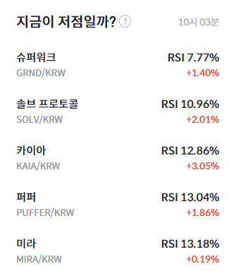 이 외에도 솔브 프로토콜(SOLV), 카이아(KAIA), 퍼퍼(PUFFER), 미라(MIRA) 등이 RSI 30 이하의 과매도 구간에 머물고 있다. 특히 슈퍼워크(7.77%)는 한 자릿수의 매우 낮은 수치를 기록하며 단기 매수세 유입 가능성이 주목된다.