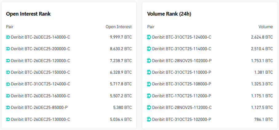 14만 달러 콜옵션(12월 26일)과 12만4000달러 콜옵션(10월 31일)에 거래 관심이 집중되고 있다.