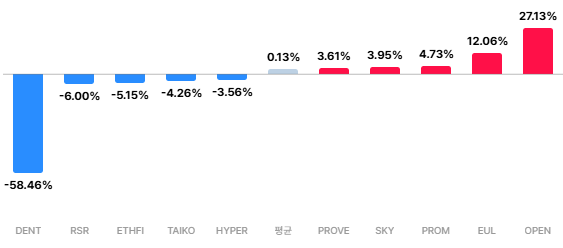 역프리미엄 구간 DENT(–58.46%)|RSR(–6.00%)|ETHFI(–5.15%)|TAIKO(–4.26%)|HYPER(–3.56%)