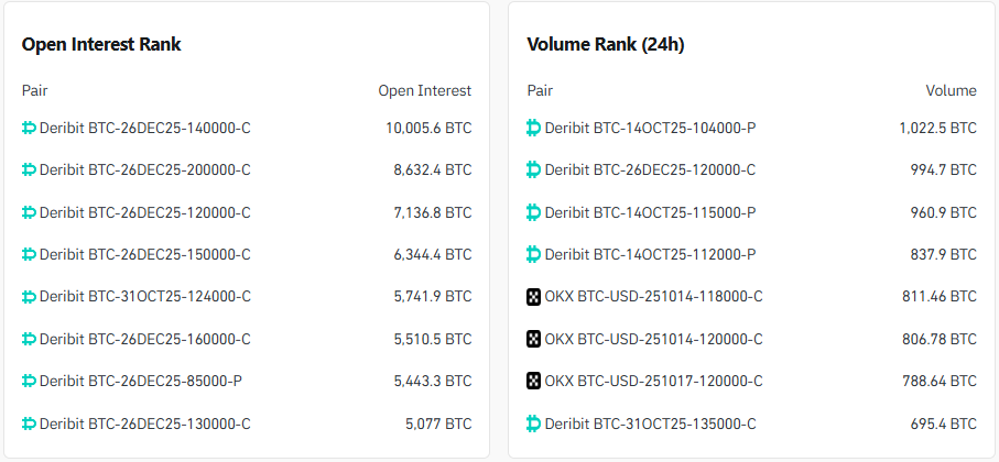 비트코인 옵션 미결제약정이 593억8000만 달러로 증가하며 14만 달러 콜옵션(12월 26일)에 매수세가 집중됐다. 거래량은 10만4000달러 풋옵션(10월 14일)이 가장 활발했다.