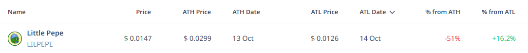 전체 1개 종목이 신저점을 경신했다. 리틀 페페는 13일 기록한 최고가(0.0299달러) 대비 절반 수준으로 내려앉았다. 전일 대비 약세를 이어가며 단기 조정을 받은 모습이다. 다만 이날 신저점(0.0126달러)을 기록한 이후 소폭 반등했다.