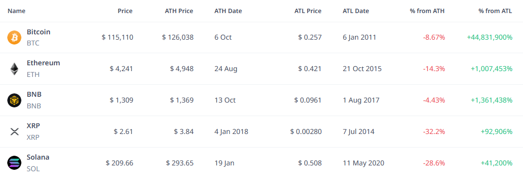 [편집자주] 암호화폐 시장은 하루 새 고점과 저점이 빠르게 바뀌는 고변동성 환경이다. 역대 최고가(ATH)와 역대 최저가(ATL) 경신 종목을 추적하면 강세와 약세 흐름을 조기에 포착할 수 있다. 크립토랭크 기준 시가총액 1000만 달러 이상 종목 중 하루 사이 고점 또는 저점을 경신한 주요 토큰을 정리하고 시가총액 상위 종목과 실시간 국내 인기 자산의 고점 대비 조정률을 함께 분석해 시장 회복 여력과 흐름을 진단한다.