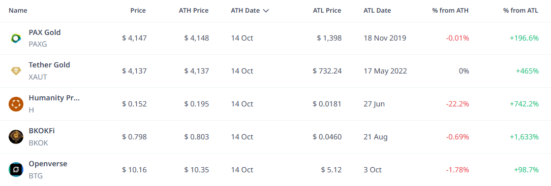 이 외에도 ▲테더 골드 토큰(XAUT0)까지 6개 종목이 14일 기준으로 신고점을 경신했다. 달러 약세와 미국 금리인하 상황에서 국제 금값이 치솟으며 사상 처음 4100달러를 넘어섰다. 이에 온체인 금 기반 토큰 팍스골드(PAXG)와 테더골드(XAUT) 등 금 연동 자산 가치가 함께 뛰어오른 모습이다.