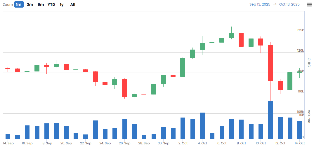 코이니지에 따르면 코인베이스 프라임의 비트코인 거래량은 10월 13일 기준 약 8142BTC로 집계됐다. 직전 10월 12일 기록한 9688BTC 대비 약 16% 감소세를 보였다. 달러 기준 24시간 거래량은 약 5억4420만 달러로 확인됐다.