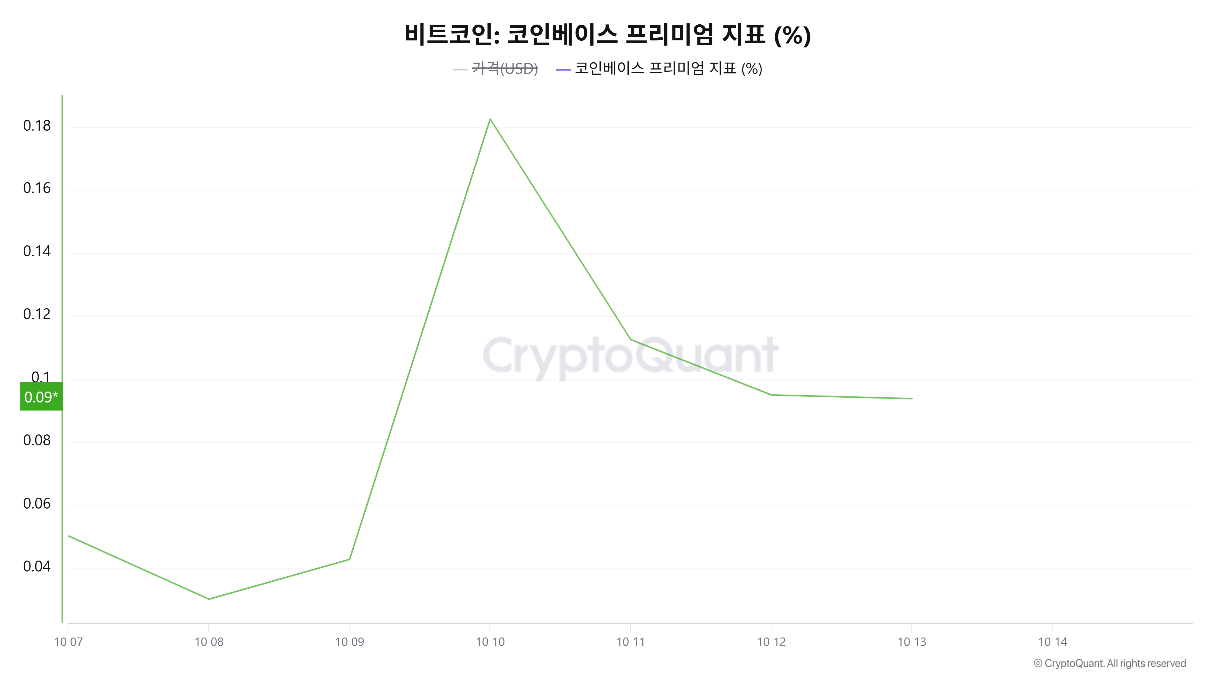 코인베이스 프리미엄 지표는 13일 기준 0.093%로, 미국 현물 시장에서 여전히 소폭의 프리미엄이 유지되고 있음을 보여주고 있다.