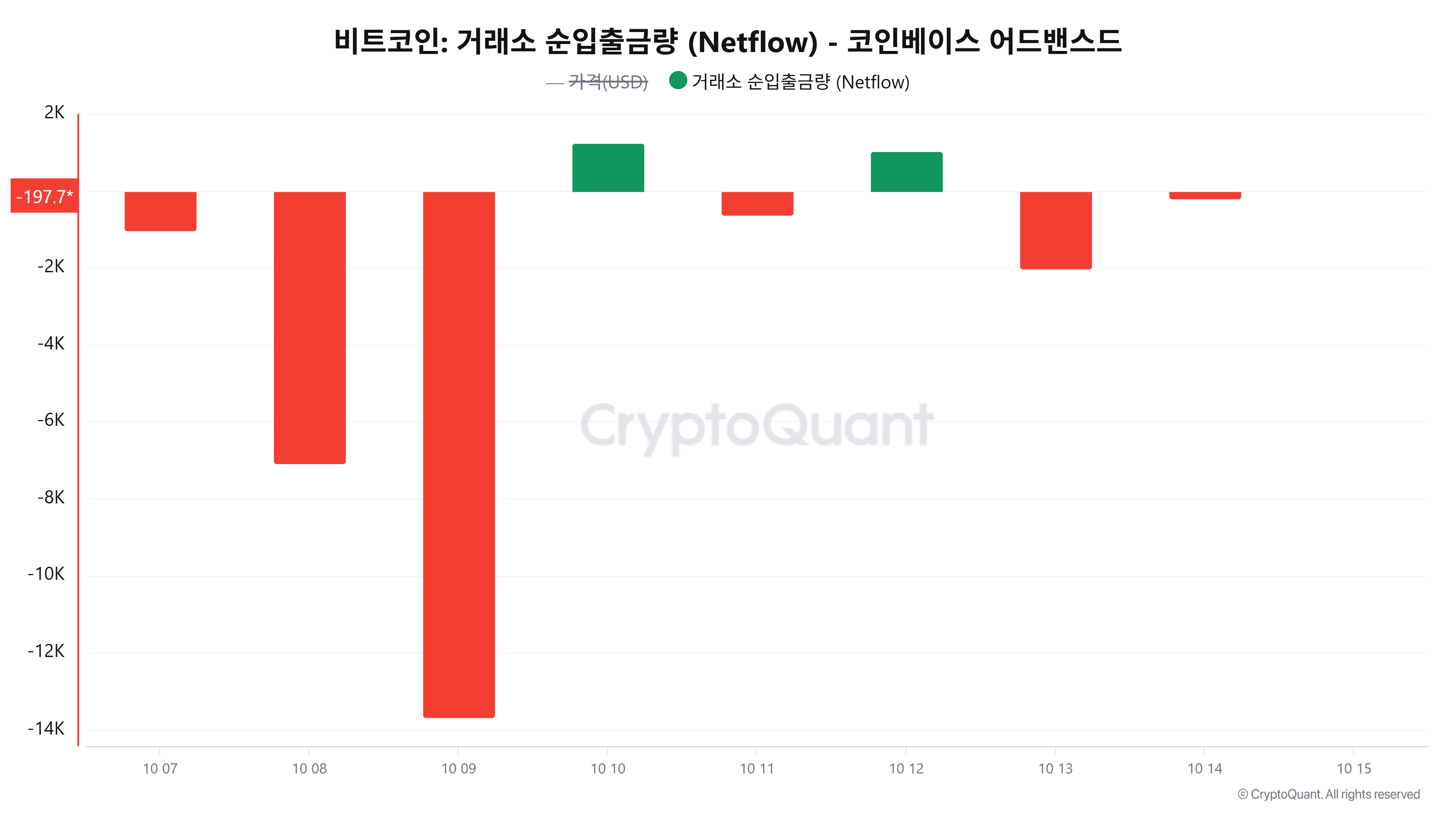 크립토퀀트 데이터에 따르면 14일(UTC 기준, 미완결 데이터) 거래소 비트코인 순입출금은 197BTC 순유출로 집계됐다.