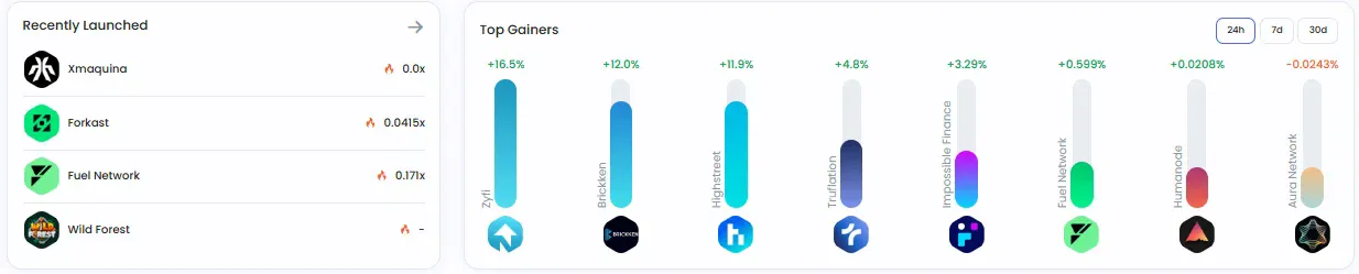 최근 해당 플랫폼에서 론칭된 프로젝트는 ▲엑스마퀴나(0.0배) ▲포카스트(0.0415배) ▲퓨얼 네트워크(0.171배) ▲와일드 포레스트 등이 있다.