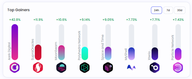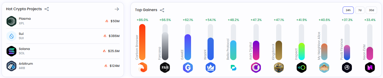 상승률 상위 프로젝트는 ▲카본브라우저(+86.0%) ▲파라나(+66.5%) ▲게임(GAME, +62.1%) ▲워직스(+54.1%) ▲벨라프로토콜(+48.2%) 순이었다.