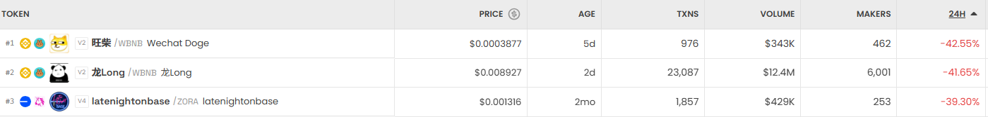 반면 가장 크게 하락한 거래쌍은 旺柴/WBNB (Wechat Doge) 로, 42% 하락하며 0.0003877달러에 거래됐다. 이어 龍Long/WBNB (龍Long) 이 41%, latenightonbase/ZORA (latenightonbase) 가 39% 떨어졌다.