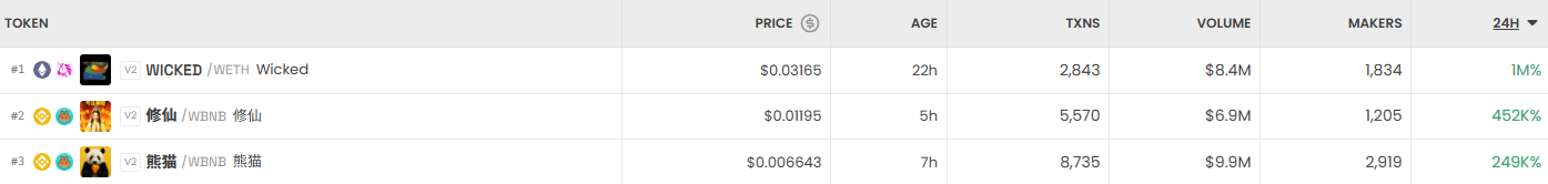 하루 동안 DEX에서 가장 크게 오른 거래쌍은 WICKED/WETH (Wicked) 으로, 1만% 급등하며 0.03165달러에 거래됐다. 이어 修仙/WBNB (修仙) 이 45만% 상승하며 0.01195달러에 거래됐고, 熊貓/WBNB (熊貓) 는 24만% 상승한 0.006643달러를 기록했다.