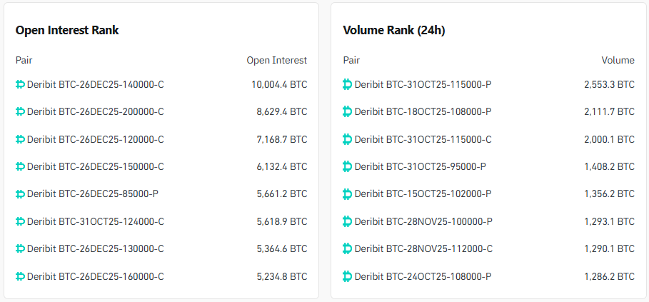 가장 많이 거래된 옵션 계약은 ▲11만5000달러 풋옵션(10월 31일) ▲10만8000달러 풋옵션(10월 18일) ▲11만5000달러 콜옵션(10월 31일)이다.