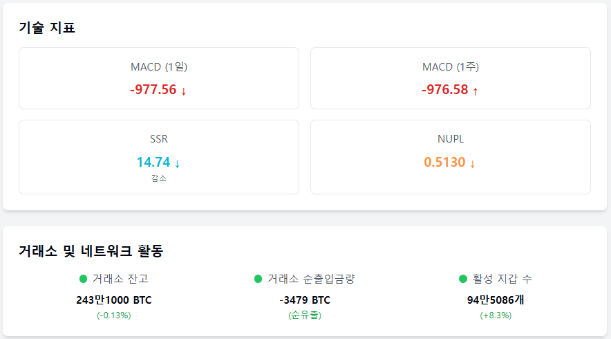 MACD –977.56 단기 MACD(1일)는 –977.56, 주간 MACD는 –976.58로 모두 음수 구간을 유지하며 하락 압력이 여전한 모습을 보이고 있다.