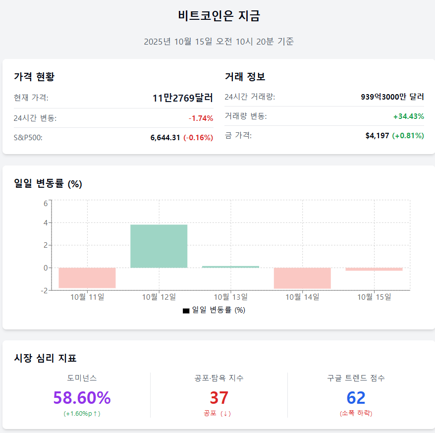 가격 11만2769달러 (–1.74%) 비트코인은 전일 대비 1.74% 하락한 11만2769달러에 거래되고 있다. 단기 조정세가 이어지고 있으나 여전히 11만 달러대 지지선을 유지하며 하방 압력을 방어 중이다.