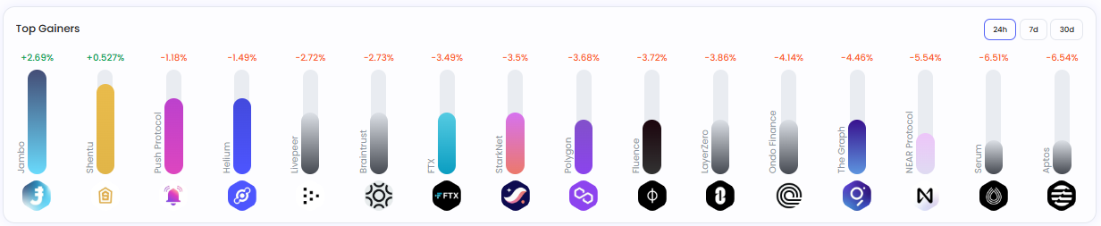 일간 상승률 기준 상위 펀드는 ▲크라켄벤처스(+78.8%) ▲FTX벤처스(+61.9%) ▲포믈리스캐피털(+41.1%) ▲Axia8벤처스(+24.9%) ▲블랙엣지캐피털(+24.4%) 순으로 나타났다.