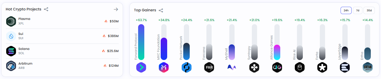 상승률 상위 프로젝트는 ▲포워드프로토콜(+63.7%) ▲MXC재단(+34.8%) ▲포켓네트워크(+24.4%) ▲파라나(+21.6%) ▲마이쉘(+21.4%) 순이었다.