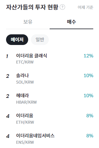 빗썸 집계에 따르면 이더리움 클래식이 12%로 가장 높은 순매수 비율을 기록했으며, 솔라나와 헤데라가 각각 10%로 뒤를 이었다. 이더리움과 이더리움네임서비스는 각각 8%를 기록하며 상위권에 포함됐다.