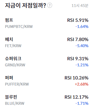 이 외에도 페치(FET), 슈퍼워크(GRND), 퍼퍼(PUFFER), 블루핀(BLUE) 등이 RSI 30 이하의 과매도 구간에 머물고 있다. 특히 펌프(5.91%)는 한 자릿수의 매우 낮은 수치를 기록하며 단기 매수세 유입 가능성이 주목된다.