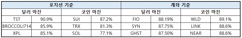 상위 트레이더 기준 종목별 포지션 비중을 살펴보면 포지션 기준으로는 달러 마진 시장에서 ▲TST(90.9%) ▲BROCCOLI714(85.9%) ▲XPL(85.1%) 순으로 롱 포지션 비중이 높게 나타났다. 코인 마진 시장에서는 ▲SUI(87.2%) ▲TRX(81.3%) ▲SOL(77.1%)이 상위권을 차지하며 주요 알트코인 중 견조한 매수세를 보였다.