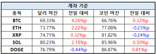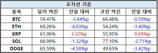 도지코인은 달러 마진 65.59%로 4.58%p 급락했고, 코인 마진 역시 49.65%로 3.42%p 감소하며 투자심리 위축이 두드러졌다.