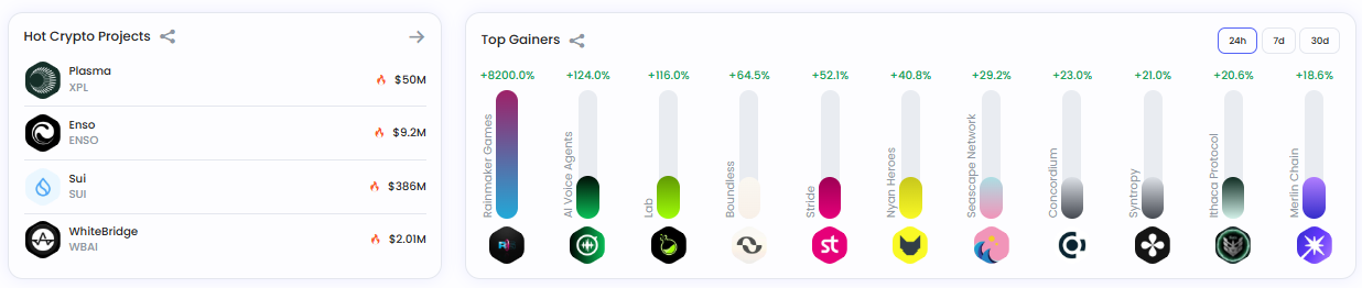 사용자 관심 기준 상위 프로젝트는 ▲플라즈마(XPL, 5000만 달러) ▲엔소(ENSO, 920만 달러) ▲수이(SUI, 3억8600만 달러) ▲화이트브릿지(WBAI, 201만 달러)로 나타났다.
