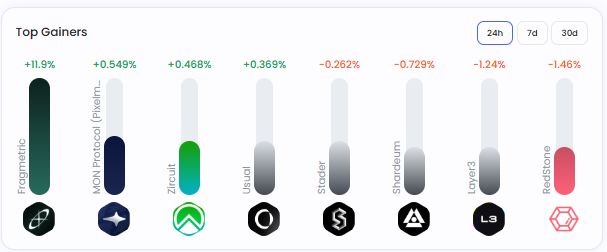 24시간 기준 상승 종목은 ▲프랙메트릭(+11.9%) ▲리졸브(–1.23%) ▲퓨얼네트워크(–4.67%) ▲실렌시오(–5.24%) ▲콘(–5.79%) 순으로 나타났다.