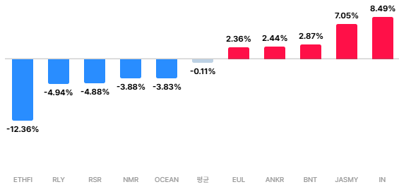역프리미엄 구간 ETHFI(–12.36%)|RLY(–4.94%)|RSR(–4.88%)|NMR(–3.88%)|OCEAN(–3.83%)