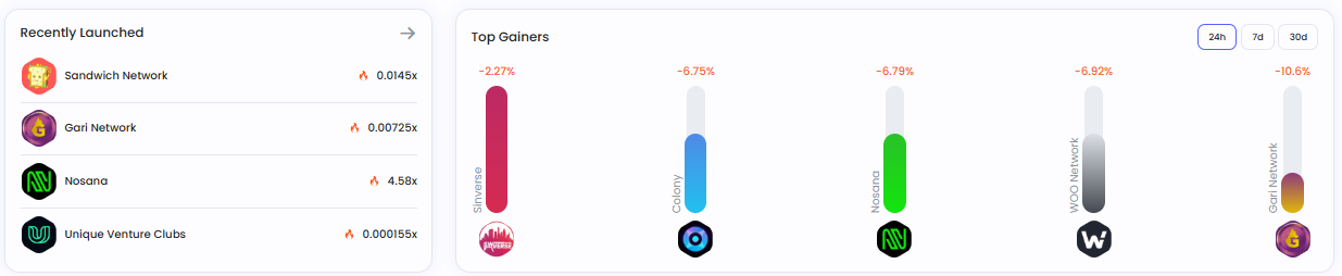 최근 해당 플랫폼에서 출시된 프로젝트는 ▲샌드위치네트워크(0.0145배) ▲가리네트워크(0.00725배) ▲노사나(4.58배) ▲유니크벤처클럽스(0.000155배) 등으로 확인됐다.