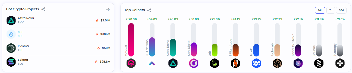 사용자 관심 기준 상위 프로젝트는 ▲아스트라노바(RVV, 201만 달러) ▲수이(SUI, 3억8600만 달러) ▲플라즈마(XPL, 5000만 달러) ▲솔라나(SOL, 2560만 달러)로 나타났다.