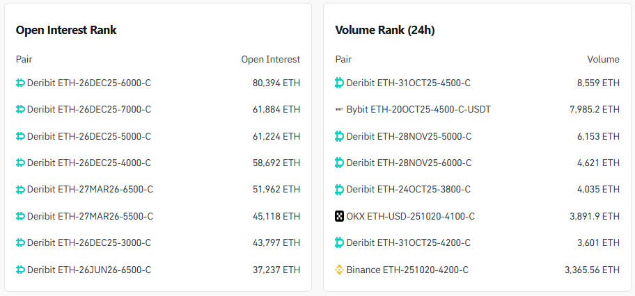 가장 많이 거래된 옵션 계약은 ▲4500달러 콜옵션(10월 31일, 데리비트) ▲4500달러 콜옵션(10월 20일, 바이비트) ▲5000달러 콜옵션(11월 28일, 데리비트)이다.
