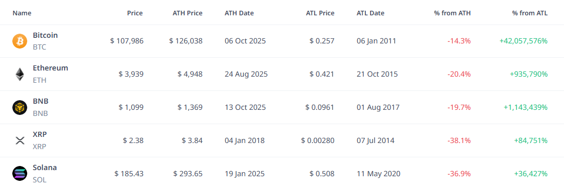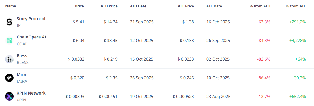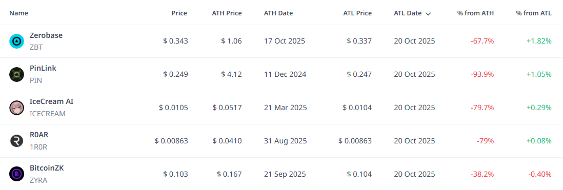 [편집자주] 암호화폐 시장은 하루 새 고점과 저점이 빠르게 바뀌는 고변동성 환경이다. 역대 최고가(ATH)와 역대 최저가(ATL) 경신 종목을 추적하면 강세와 약세 흐름을 조기에 포착할 수 있다. 크립토랭크 기준 시가총액 1000만 달러 이상 종목 중 하루 사이 고점 또는 저점을 경신한 주요 토큰을 정리하고 시가총액 상위 종목과 실시간 국내 인기 자산의 고점 대비 조정률을 함께 분석해 시장 회복 여력과 흐름을 진단한다.