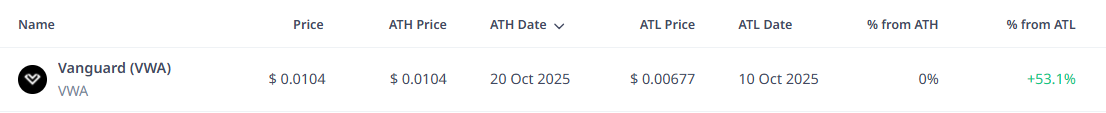 이날 뱅가드(VWA) 1개 종목이 신고점을 경신했다. 10월 10일 기록한 최저가(0.00677달러) 대비 53.1% 상승하며 단기 강세 흐름을 이어가고 있다.
