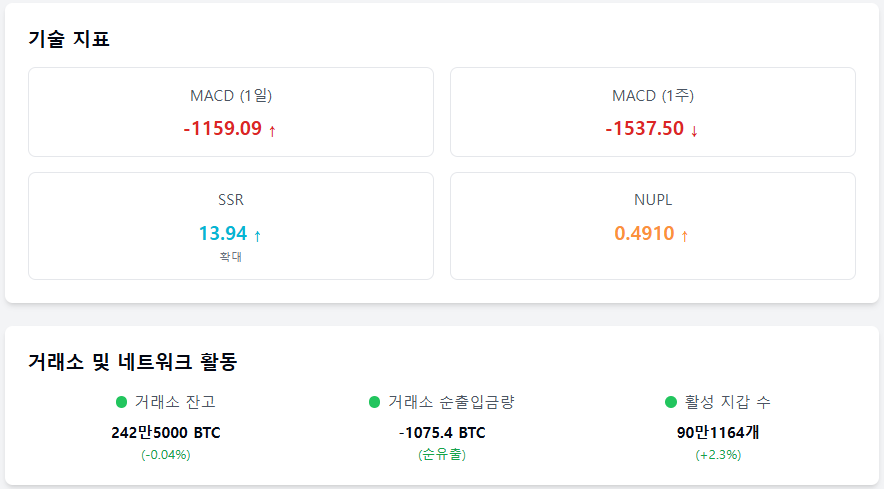 활성 지갑 수 90만1164개 (+2.3%) 활성 지갑 수는 전일(97만8324개) 대비 증가하며 온체인 활동이 점진적으로 회복되고 있다.