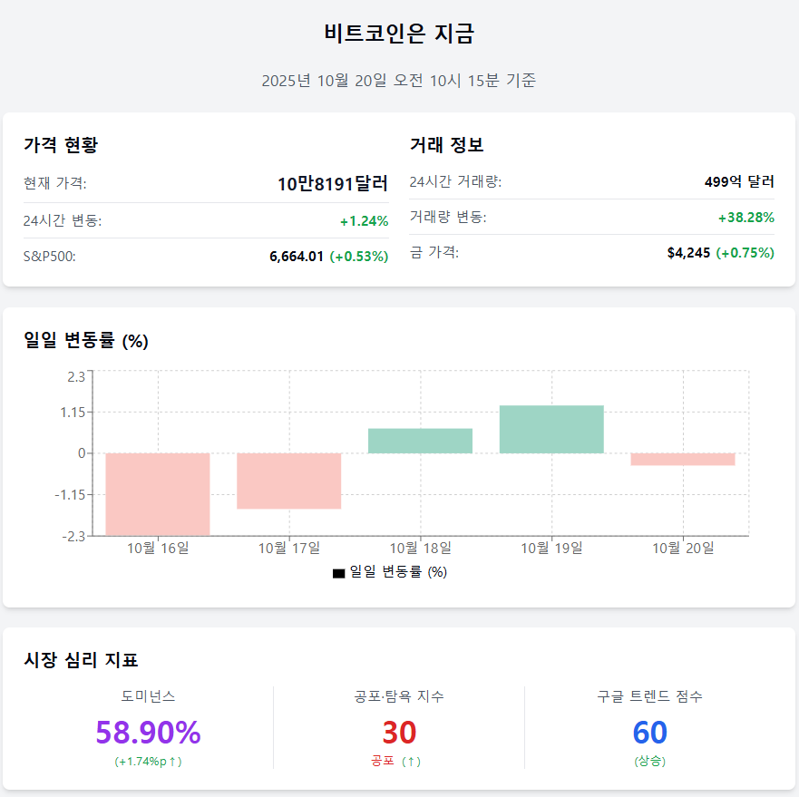 일일 변동률 –0.34% 최근 5거래일간 비트코인은 ▲16일 –2.28% ▲17일 –1.55% ▲18일 +0.69% ▲19일 +1.33% ▲20일 –0.34%로, 단기 낙폭 이후 이틀간의 반등세가 이어졌지만 다시 조정 흐름이 나타나며 상승 탄력이 둔화된 모습이다.