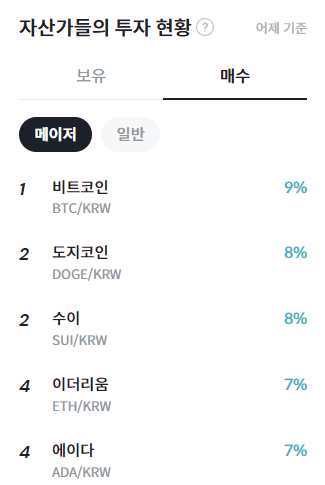 자산가들이 20일 오후 기준 가장 많이 매수한 암호화폐는 비트코인(BTC), 도지코인(DOGE), 수이(SUI), 이더리움(ETH), 에이다(ADA) 순으로 나타났다.