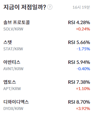 솔브 프로토콜(SOLV)이 RSI 4.28%(+0.24%)로 가장 낮은 수준을 보였으며, 스탯(STAT)이 5.66%(-1.75%), 아반티스(AVNT)가 5.94%(-0.40%), 앱토스(APT)가 7.38%(+1.10%), 디와이디엑스(DYDX)가 8.70%(+3.92%)로 집계됐다.