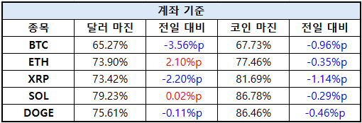 도지코인은 달러 마진 75.61%로 0.11%p 하락했으며, 코인 마진은 86.46%로 0.46%p 감소했다.