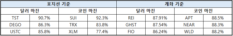 상위 트레이더 기준 종목별 포지션 비중을 살펴보면 포지션 기준으로는 달러 마진 시장에서 ▲TST(90.7%) ▲DEGO(86.3%) ▲USTC(85.8%) 순으로 롱 포지션 비중이 높게 나타났다. 코인 마진 시장에서는 ▲SUI(92.3%) ▲TRX(83.8%) ▲XLM(77.4%)이 상위권을 차지했다.