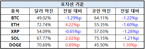 XRP는 달러 마진 73.42%로 2.20%p 감소했고, 코인 마진은 81.69%로 1.14%p 하락했다.