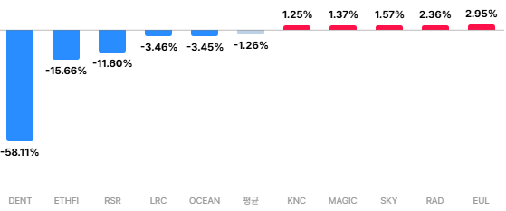 역프리미엄 구간 DENT(–58.11%)|ETHFI(–15.66%)|RSR(–11.60%)|LRC(–3.46%)|OCEAN(–3.45%)