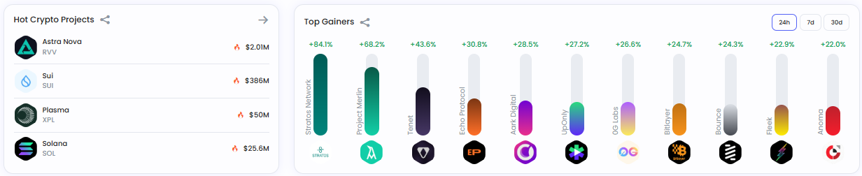 사용자 관심 기준 상위 프로젝트는 ▲아스트라노바(RVV, 201만 달러) ▲수이(SUI, 3억8600만 달러) ▲플라즈마(XPL, 5000만 달러) ▲솔라나(SOL, 2560만 달러)로 나타났다.