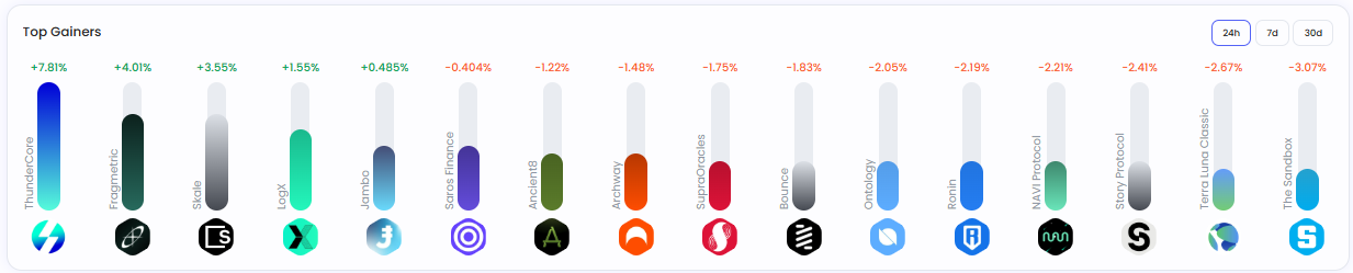 24시간 기준 하락 종목은 ▲산토스FC팬토큰(–1.15%) ▲FC포르투(–2.52%) ▲아이겐파이(–3.58%) ▲케이크파이(–3.91%) ▲리스트DAO(–7.35%) ▲솔브프로토콜(–7.68%) 순으로 나타났다.