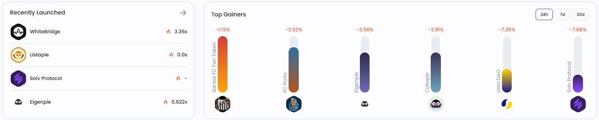 최근 해당 플랫폼에서 출시된 프로젝트는 ▲화이트브릿지(3.36배) ▲리스트파이(0.0배) ▲솔브프로토콜(–) ▲아이겐파이(0.622배) 등으로 확인됐다.