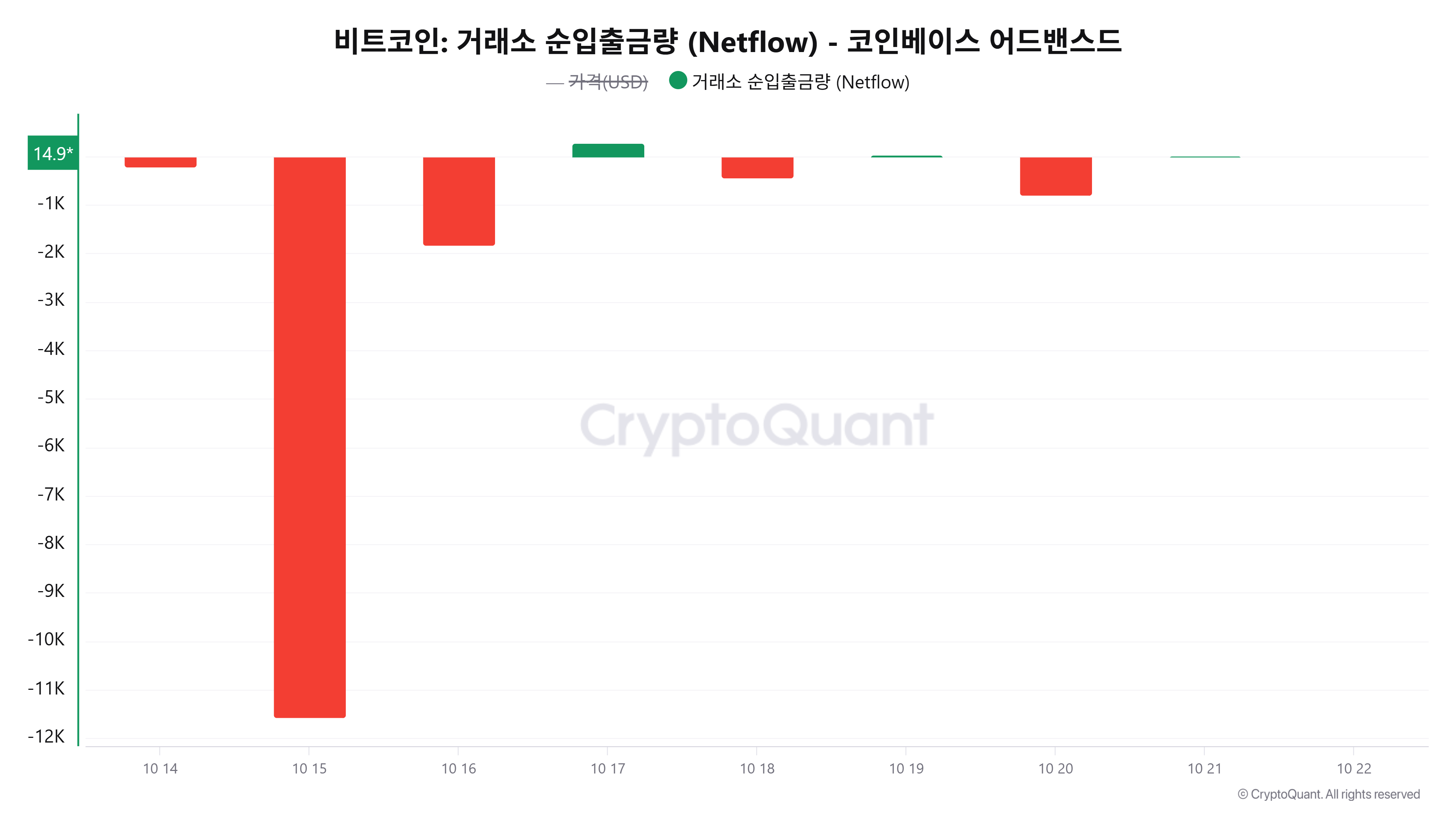 최근 일주일간 흐름을 보면 ▲15일 –1만1568.6BTC ▲16일 –1822.0BTC 등 대규모 유출이 이어진 뒤 ▲17일 +284.1BTC ▲18일 –433.3BTC ▲19일 +31.0BTC ▲20일 –791.1BTC ▲21일 +14.9BTC로, 소규모 유입과 유출이 교차하는 혼조세를 보이고 있다.