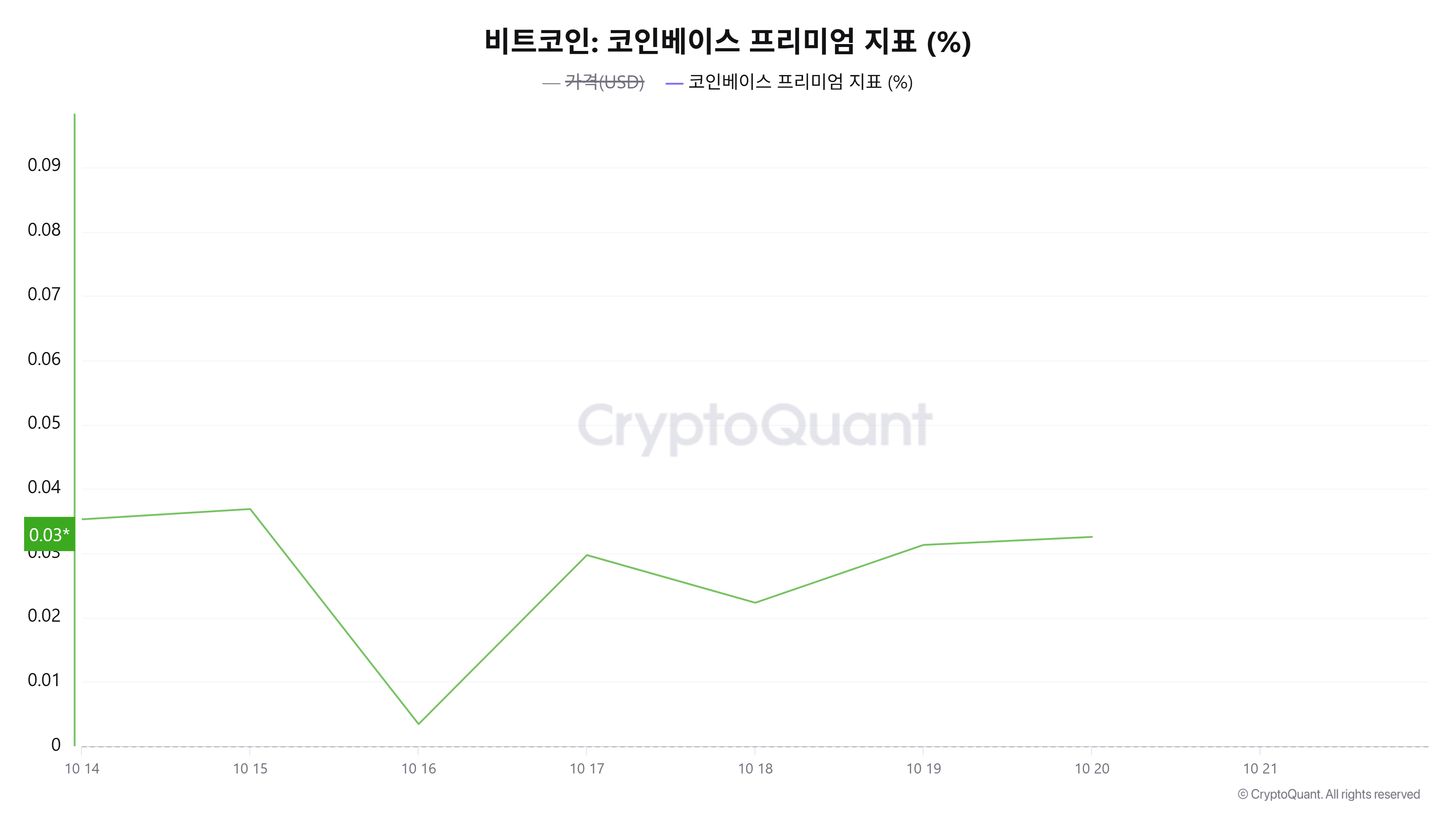코인베이스 프리미엄 지표는 20일 기준 0.032%로, 미국 현물 시장에서 소폭의 프리미엄이 유지되고 있다.