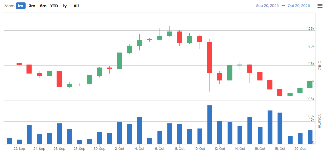 코이니지에 따르면 코인베이스 프라임의 비트코인 거래량은 10월 20일 기준 약 6310BTC로 집계됐다. 직전 19일 기록한 4842BTC 대비 약 30% 증가하며 거래 활동이 확대됐다. 달러 기준 24시간 거래량은 약 5억2358만 달러로 확인됐다.