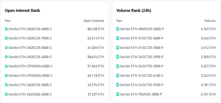 가장 많이 거래된 옵션 계약은 ▲3000달러 풋옵션(11월 28일, 데리비트) ▲3600달러 풋옵션(10월 31일, 데리비트) ▲3500달러 풋옵션(10월 31일, 데리비트)이다.