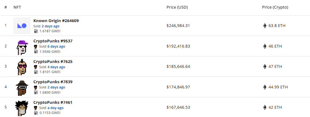 지난주 역시 최고가 NFT 상위권 대부분을 크립토펑크가 차지했다. 지난주 최고가에 거래된 NFT는 '노운 오리진(Known Origin) #264609'으로, 24만6984달러(63.8 ETH)에 판매됐다.