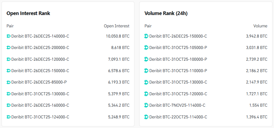 가장 많이 거래된 옵션 계약은 ▲15만 달러 콜옵션(12월 26일) ▲10만5000달러 콜옵션(10월 31일) ▲10만 달러 풋옵션(10월 31일) 순으로 집계됐다.